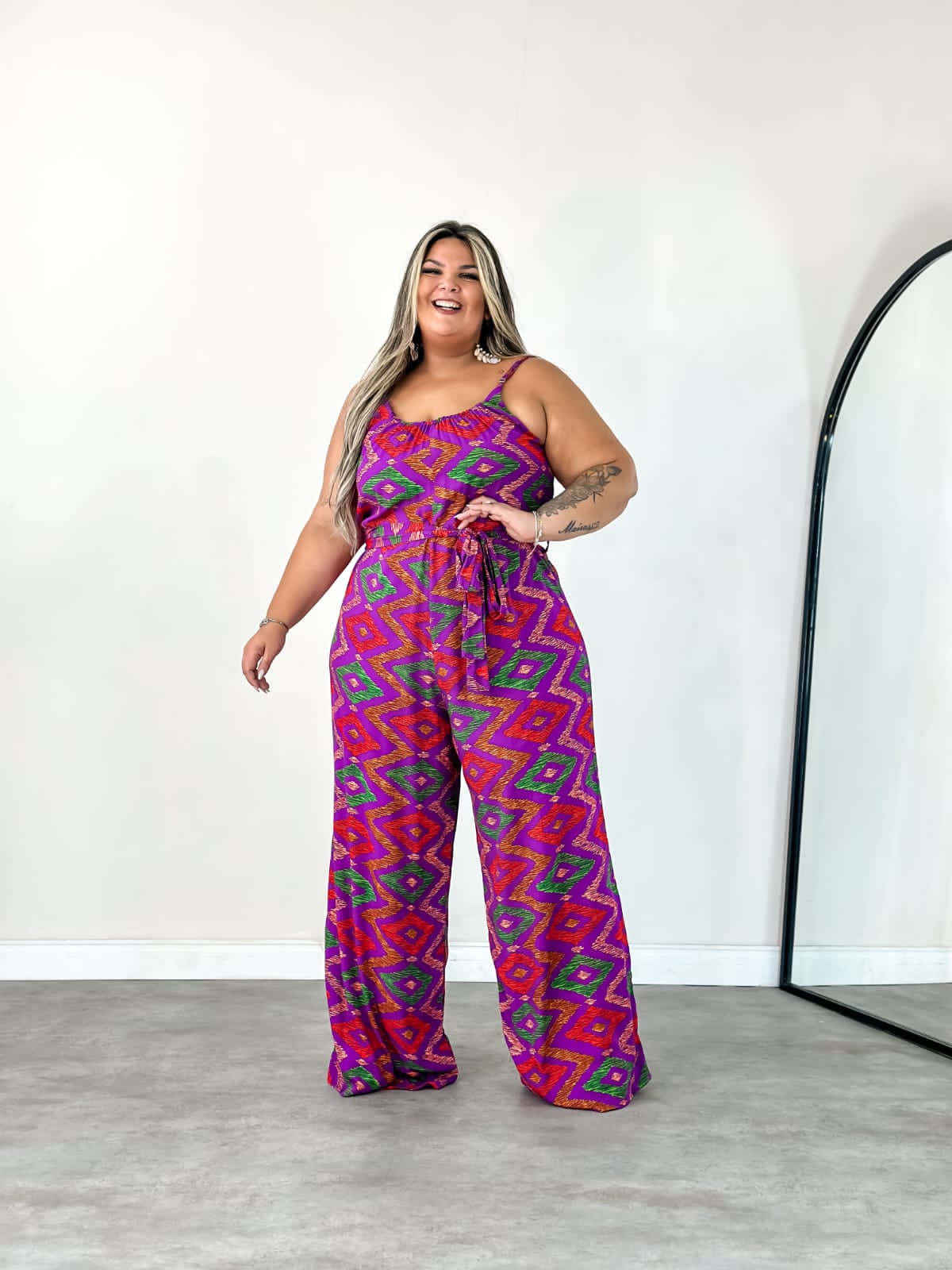 Macacão longo pantalona com fecho nas costas, alça regulável é faixa removivél.