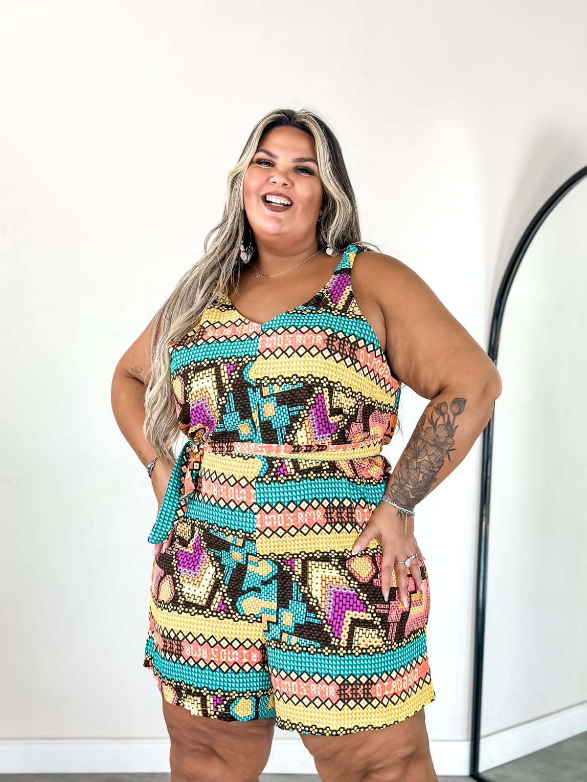 Macaquinho 100% viscose com fecho nas costas é amarração na cintura.