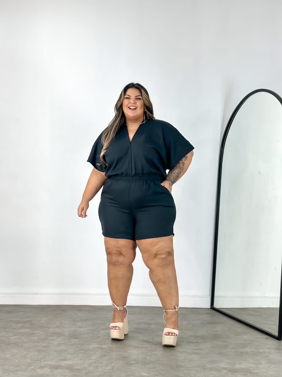Macaquinho nada básico preto com manga morcego e decote nas costas.